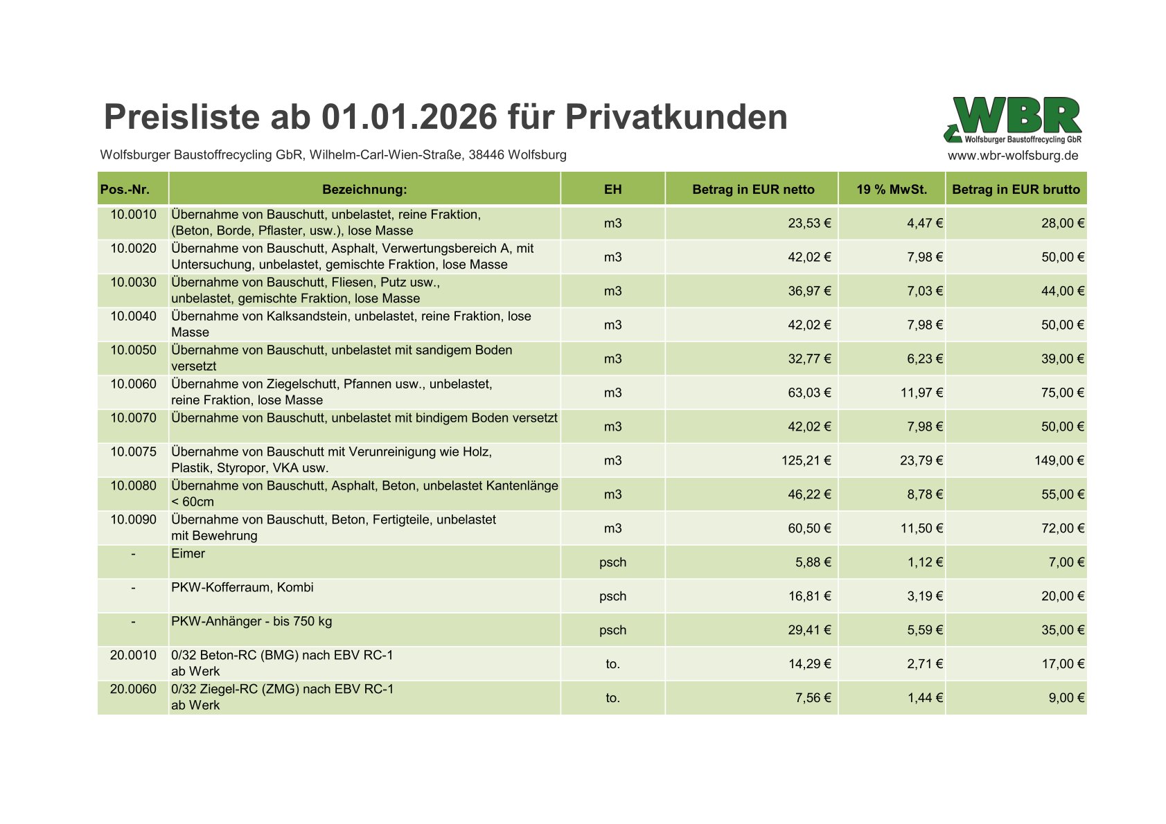 | 10.0090 | Übernahme von Bauschutt, Beton, Fertigteile, unbelastet mit Bewehrung |